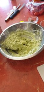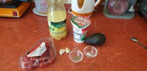 2.lépés: Az avokádót szétnyomjuk villával, majd egy kanál tejfölt, sót és borsot (ízlés szerint) rakunk bele. A fokhagymát megpucoljuk és összenyomjuk késsel vagy fokhagyma nyomóval és belekeverjük. Egy kis citromlével meglocsoljuk.