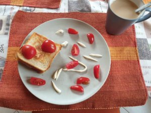 3 lépés: Majd a két szelet kenyeret egymásra rakjuk. Tálaljuk paradicsommal és majonézzel.