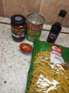 Első körben főzzük ki a tésztát. Tegyük a tonhalat serpenyőbe vagy fazékba, és pirítsuk meg,majd öntsük rá a paradicsomos szószt. Ha ezzel megvagyunk öntsük hozzá a kifőtt tésztát.Kavarjuk egybe,hagyjuk pár percig főni,majd öntsünk bele ízlés szerint szójaszószt(ez a lépés abszolút elhagyható) majd a legvégén pedig tegyük hozzá a kockákra vágott paradicsomot és hagyjuk pár percig főni.